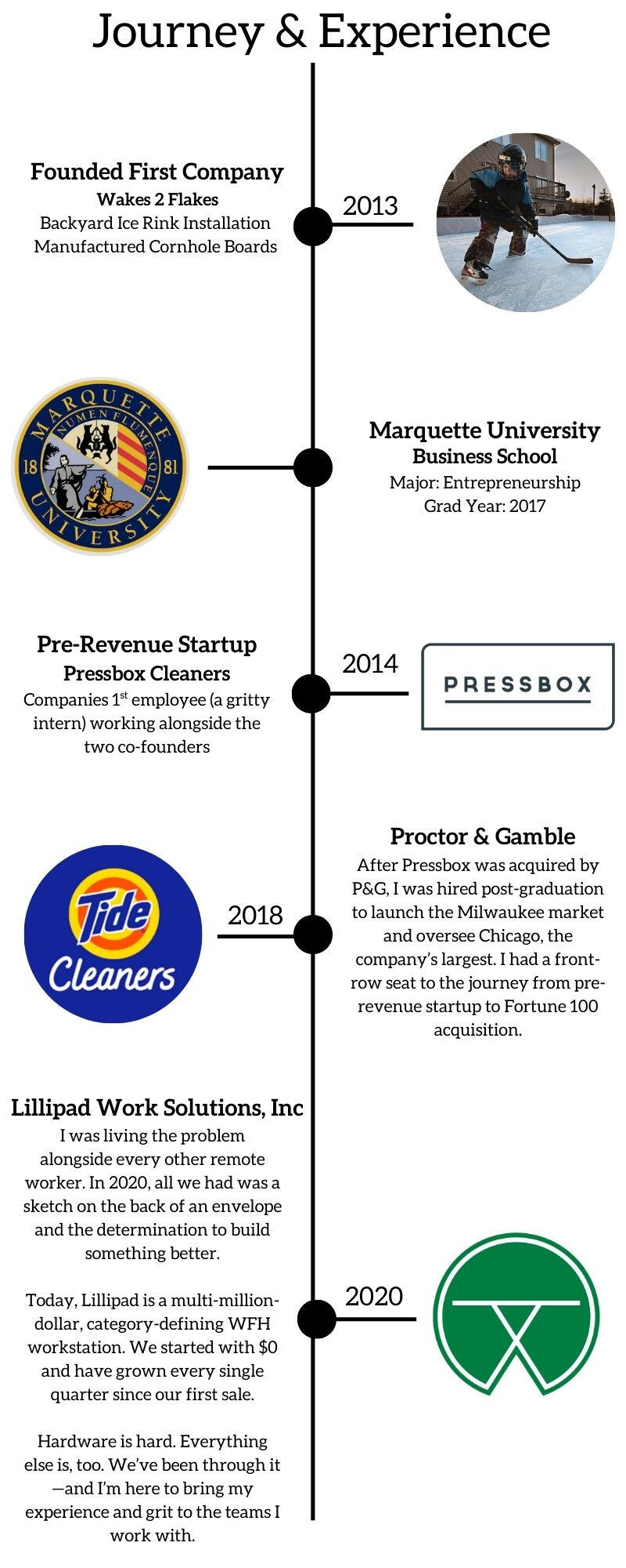 I’m a founder, operator, and product-first entrepreneur who knows how to start companies and how to scale them. Over the past decade, I’ve taken ideas from napkin sketches to garage prototypes to production lines, scaling businesses across e-commerce and B2B.I started my first business in 2013 as a high-school senior, running a seasonal backyard ice rink installation company. I later majored in Entrepreneurship at Marquette University and helped scale Pressbox Cleaners from pre-revenue to acquisition by Procter & Gamble (Tide Cleaners), launching new markets and overseeing growth.In 2020, I founded Lillipad, a category-disrupting proprietary portable workstation. As CEO, I've lead everything the business requires... literally, everything. We've maintained 99% customer satisfaction and have earned recognition from Architectural Digest, People Magazine, Men’s Health, and more.I’ve made real mistakes, learned quickly, and built better systems as a result. Today, I work alongside founders at any stage, from concept to scale, operating as an extension of their team. If you’d like to explore working together, please submit the form below or email [email protected]